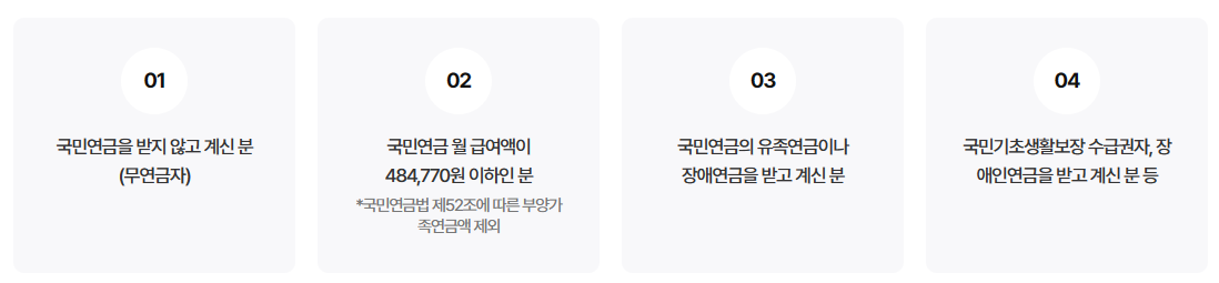 - 직역연금(공무원·사립학교교직원·군인·별정우체국 연금) 수급권자와 그 배우자는 대상에서 제외