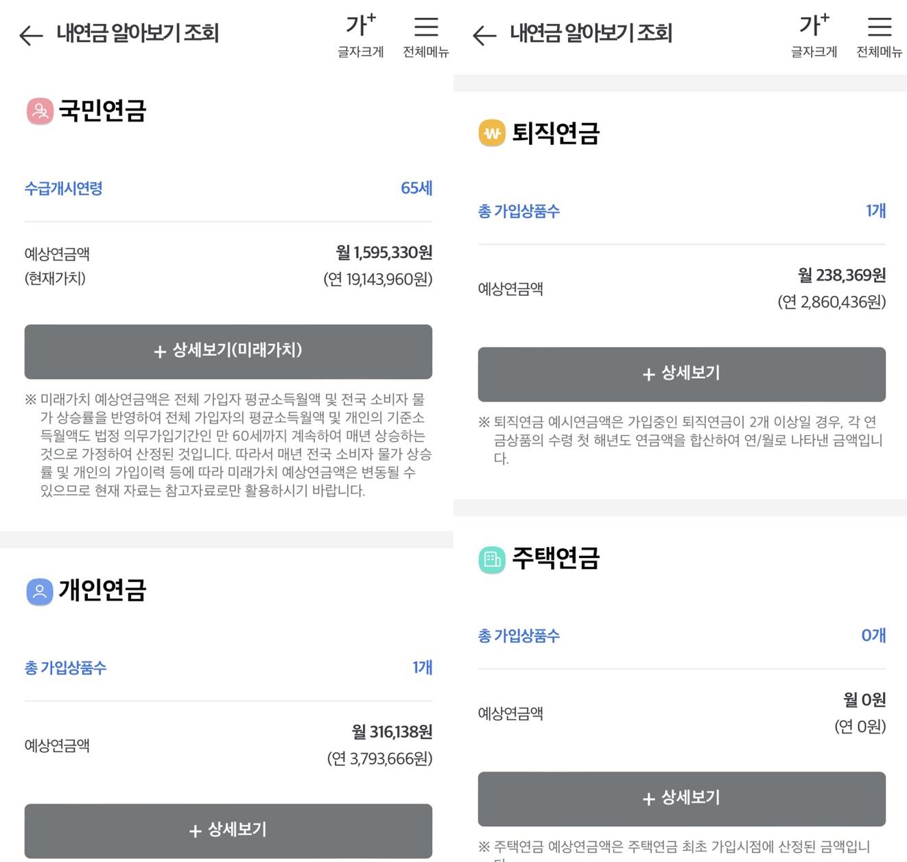 국민연금/ 개인연금/ 퇴직연금/ 주택연금의 간략한 연/월 예상연금액을 확인 할 수 있습니다.