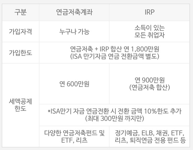 * ISA 만기 자금을 연금전화할 경우 전환금액 10%한도, 최대 300만원까지 추가로 세액공제 가능합니다. 이 경우는 연1,200만원까지 세액공제가 가능합니다.
