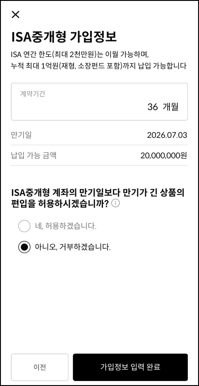 ISA 중개형 계좌의 만기일보다 만기일이 긴 상품의 편입 허용여부는 거부하는 것으로 체크했습니다.