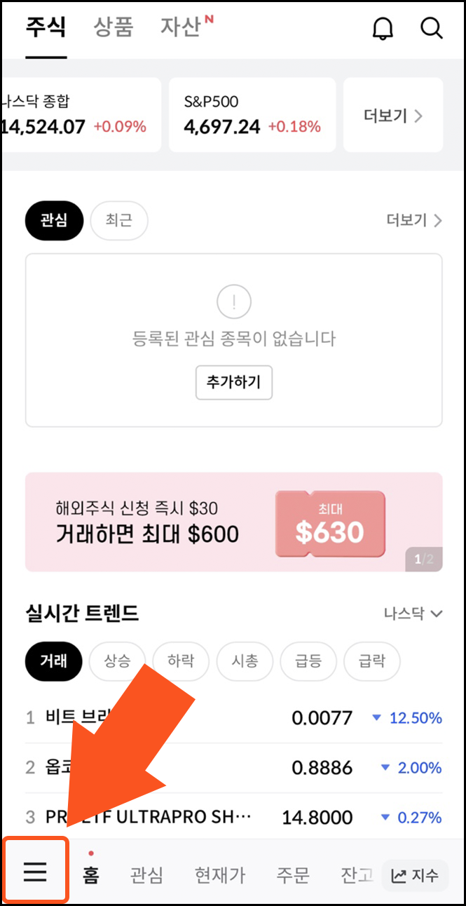 한국투자증권을 가입한 후, 홈화면에서 좌측 하단 햄버거 버튼을 누릅니다.