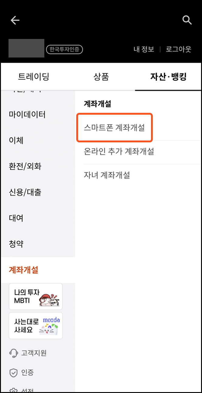 자산/뱅킹에서 계좌개설 탭을 누르고, 스마트폰 계좌개설을 선택합니다.
