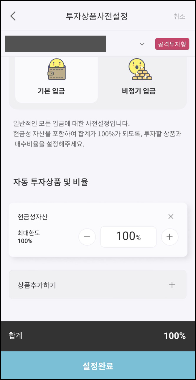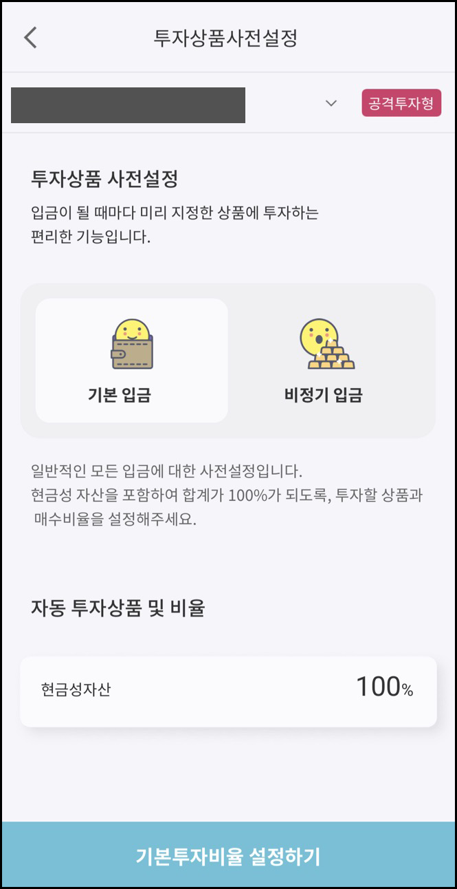 사전설정은 입금이 될 때마다 미리 지정한 상품에 투자하는 기능입니다. 기본투자비율 설정 버튼을 누른 후, 현금성자산을 포함하여 합계가 100%가 되도록 투자할상품과 매수 비율을 설정합니다.