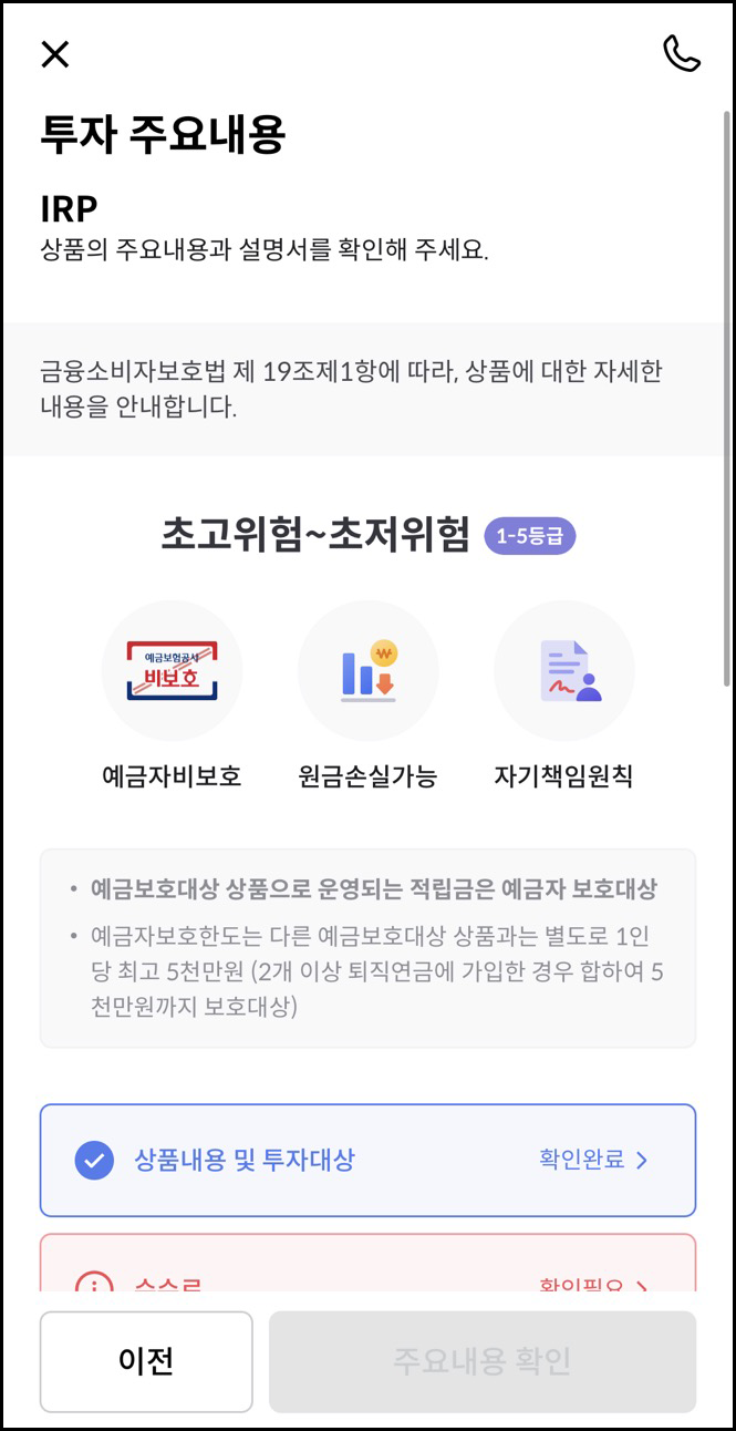 IRP는 예금자비보호 상품으로 원금손실 가능성이 있는 상품입니다. 단 예금보호대상 상품(ex 예금)으로 운영하는 적립금은 예금자 보호대상이 됩니다.