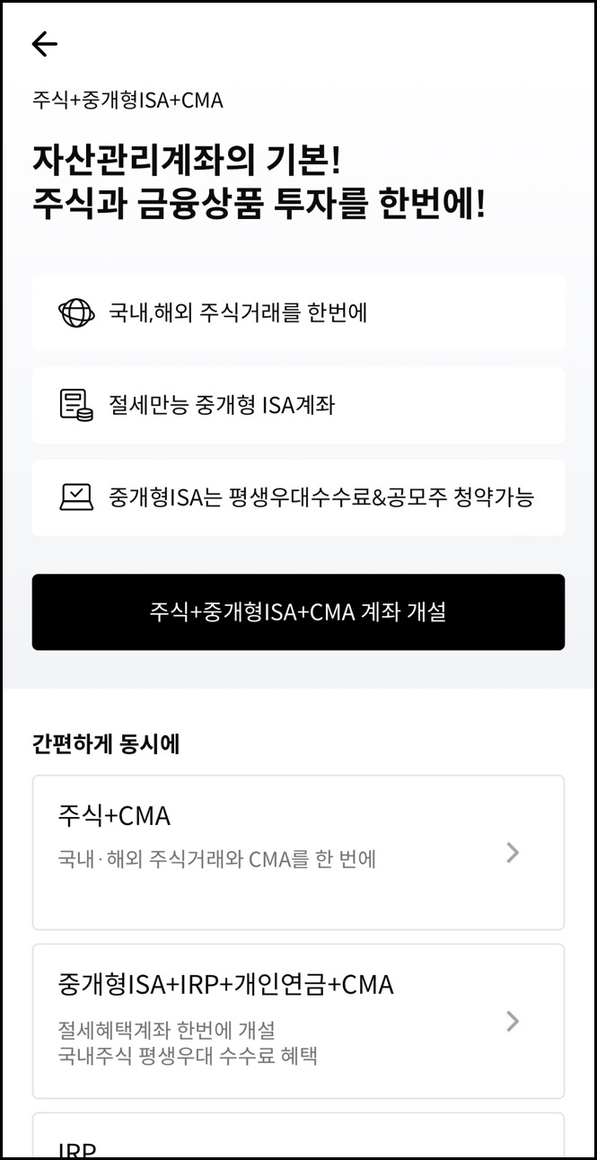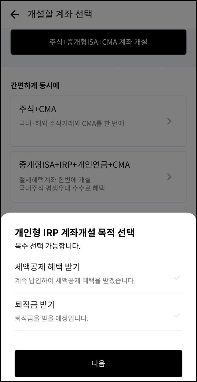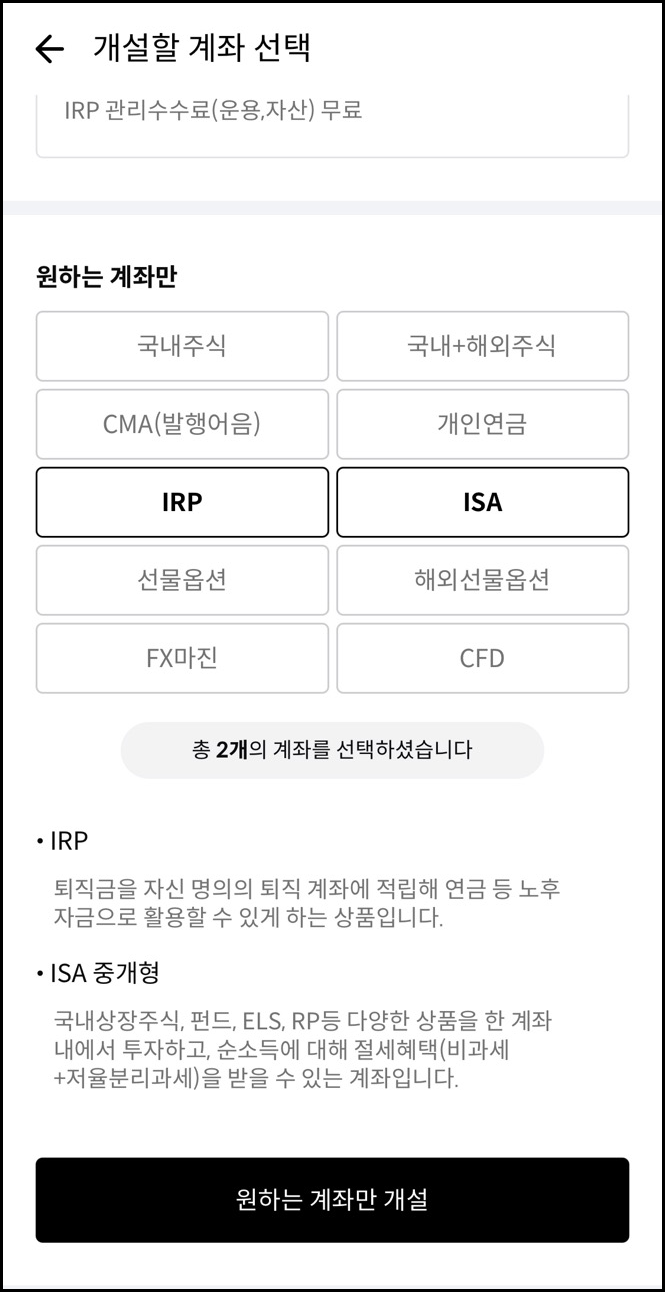 물론 IRP 계좌만 개설하고 싶다면 IRP만 선택하시면 됩니다.