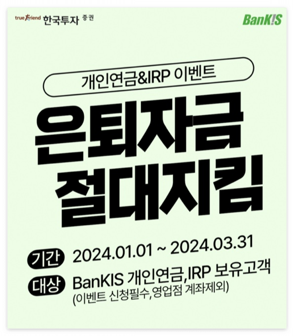 <은퇴자금 절대지킴> 뱅키스 개인연금/IRP 이벤트 진행중 - 진행중인 이벤트 - 이벤트 - 공지/이벤트 - 이용안내 | 한국투자증권 (koreainvestment.com)