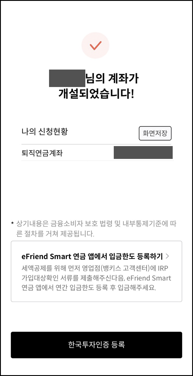 주요내용을 모두 확인하면, 개인형 IRP 계좌 개설이 완료됩니다.