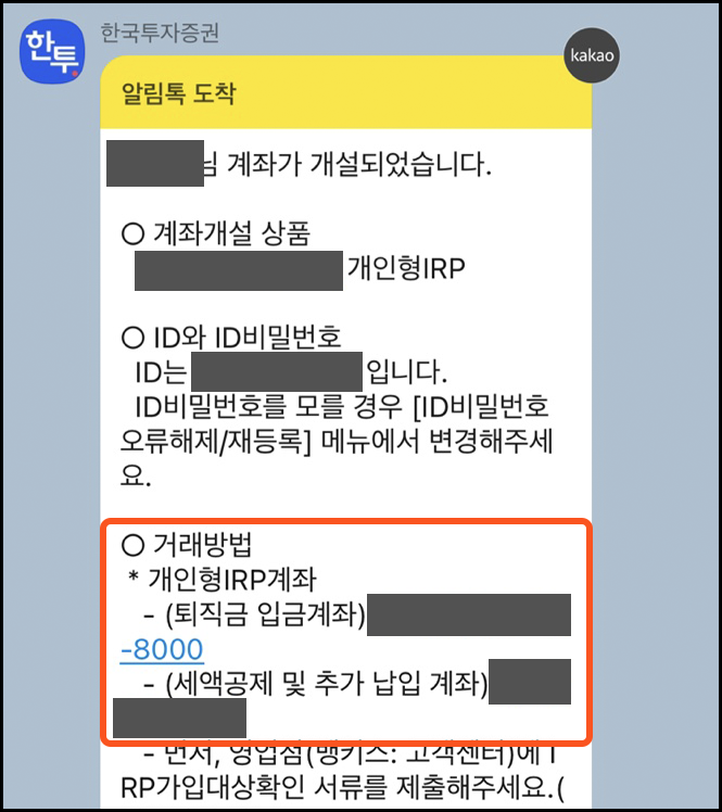 퇴직금용 입금계좌는 뒤에 8000이 붙는데, 이 계좌를 회사에 전달해주면 됩니다. (예시: 12345678 - 29 - 8000)
