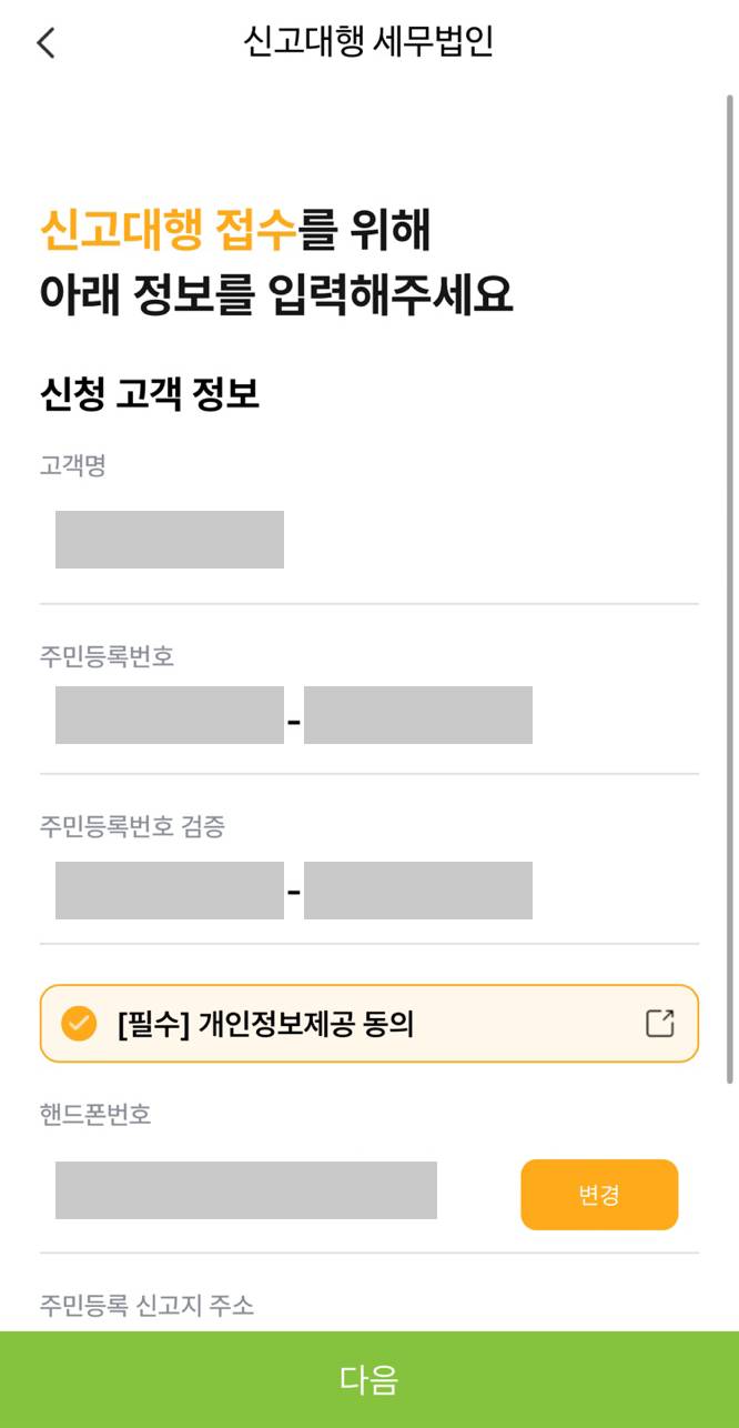 1. 신청고객의 정보를 기입합니다. 신고지 주소가 변경된 경우 수정해줍니다.