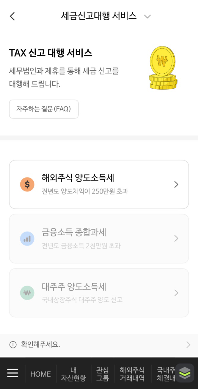 신고대행서비스 > 해외주식 양도소득세 버튼을 누릅니다.
