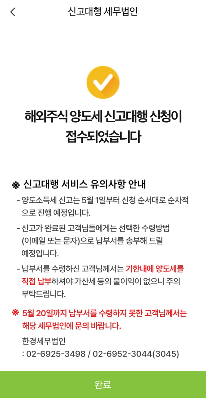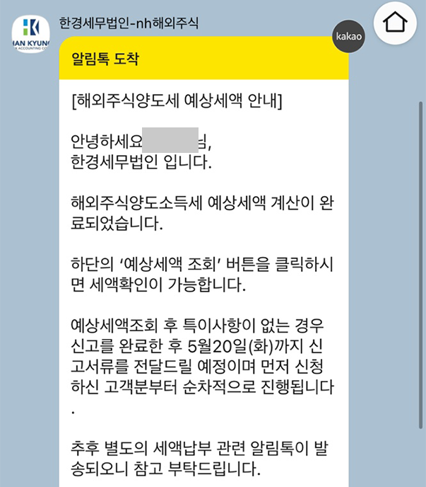양도소득세 신고대행을 완료하니 한경세무법인에서 알람톡이 오네요.