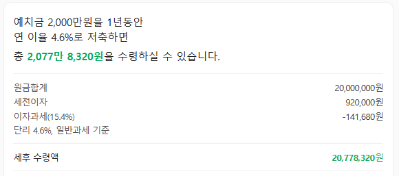 예치금액 2000만원 / 예금기간 1년 / 연이자율 단리 4.6%