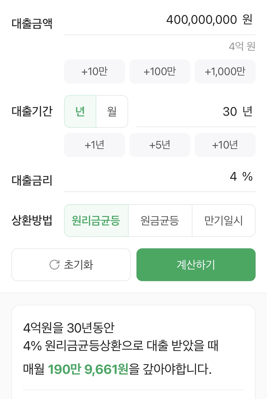 4억 대출시 매월 190만 9,661원