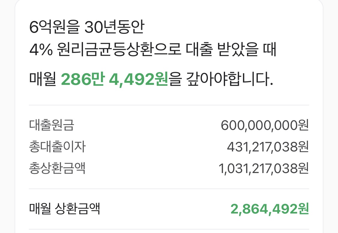 6억 정도의 대출은 이자만 해도 매달 큰 금액이 나가기 때문에 미리 계산해보고 내 상황에 맞게 계획을 세우는 게 중요할 것 같습니다.